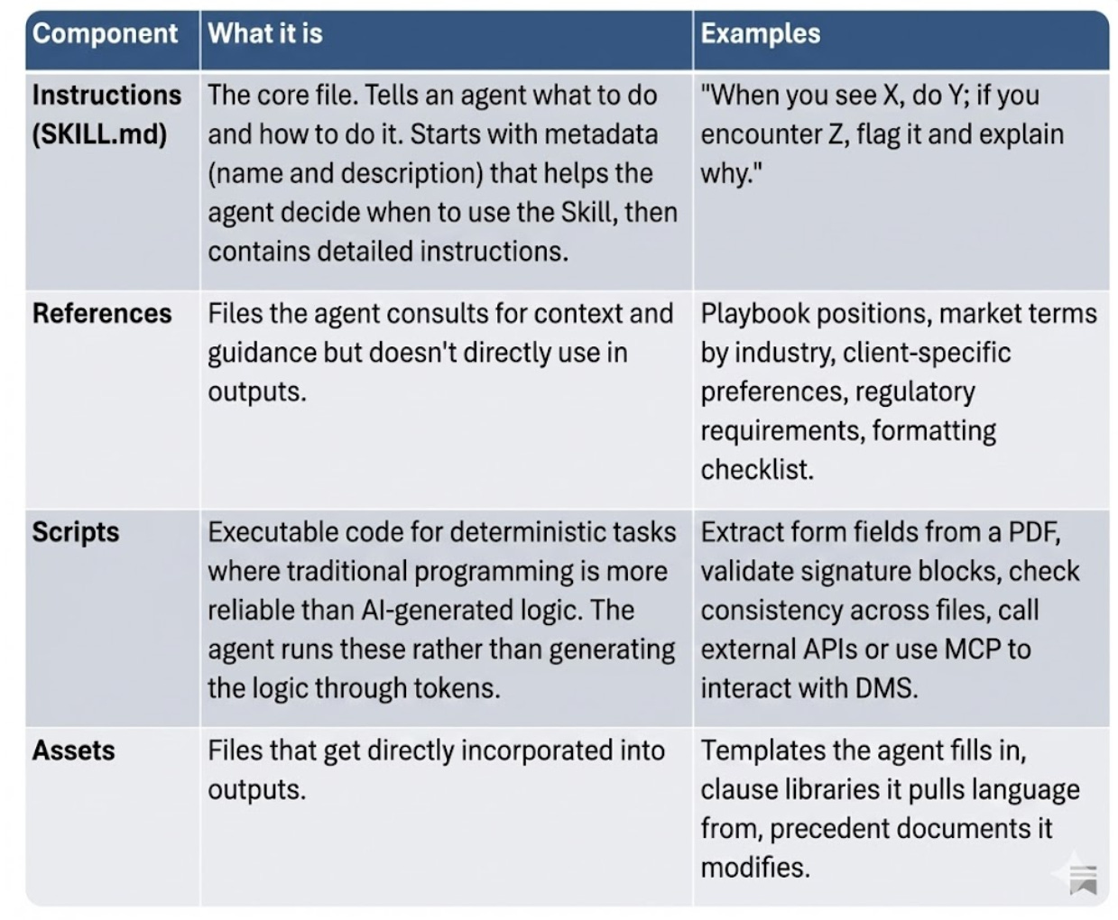 When an agent loads a Skill, it transforms from generalist to specialist. The Skill tells it: this is how we do this type of work, these are our standards, these are our preferences, this is when to flag issues for human attorney, and so on.